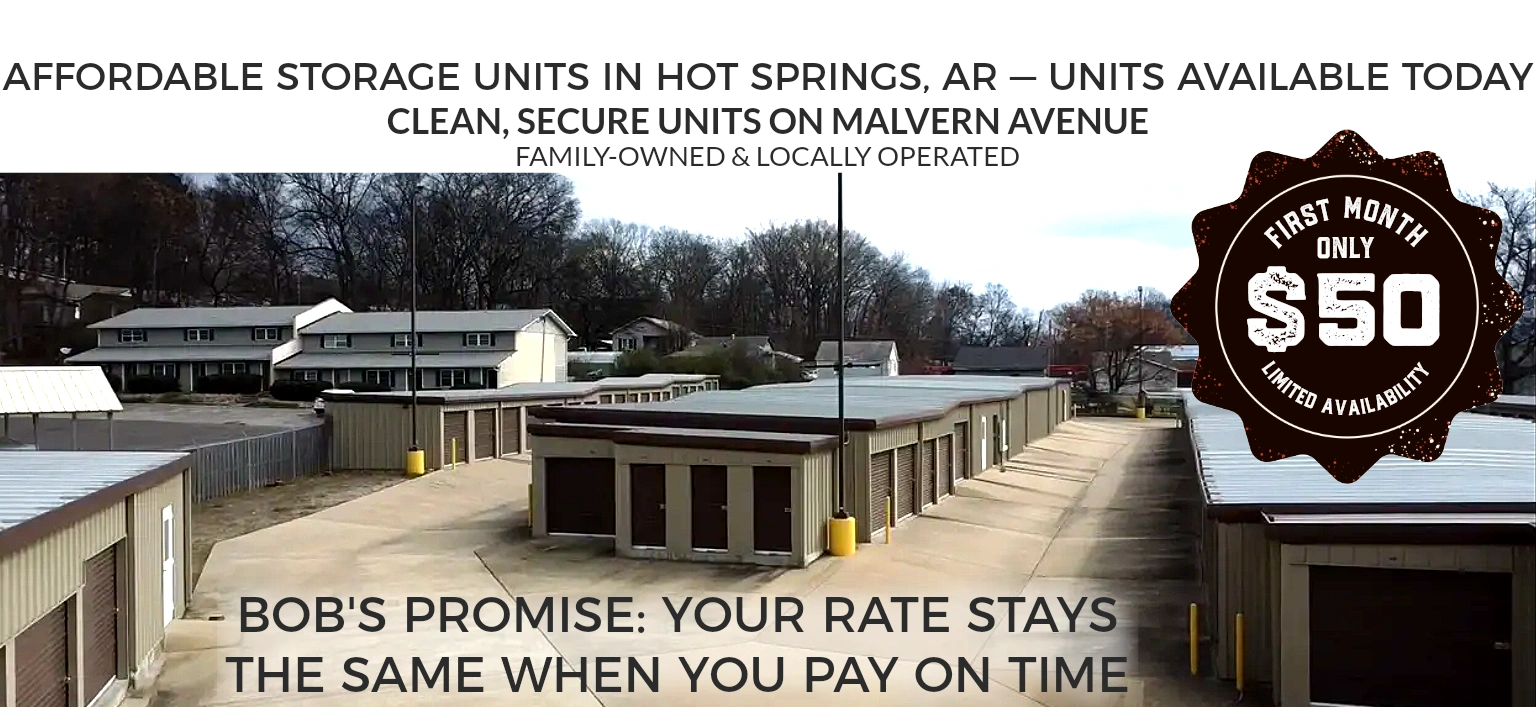 Bob's Mini Storage is a locally owned and operated self-storage facility serving Hot Springs and the surrounding area. Conveniently located on Malvern Avenue just one mile east of the Highway 270 bypass, we make it easy to access your belongings when you need them.